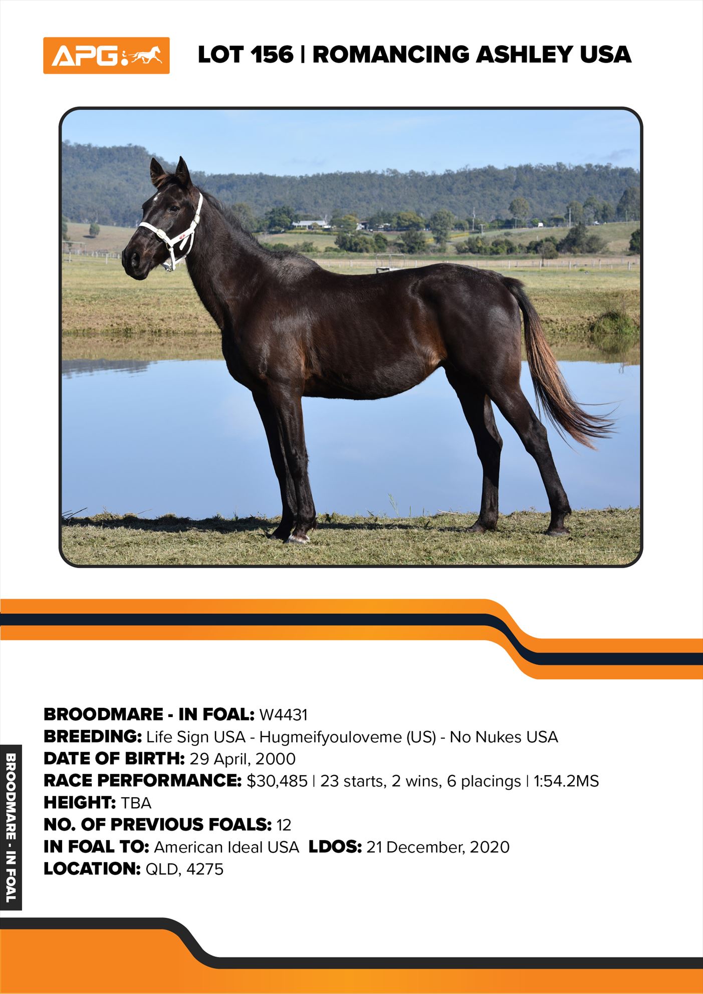 | Mare(+) | Romancing Ashley USA | Life Sign USA | Hugmeifyouloveme (US) | Brisbane Pastoral Company Pty Ltd | QLD, 4275 |