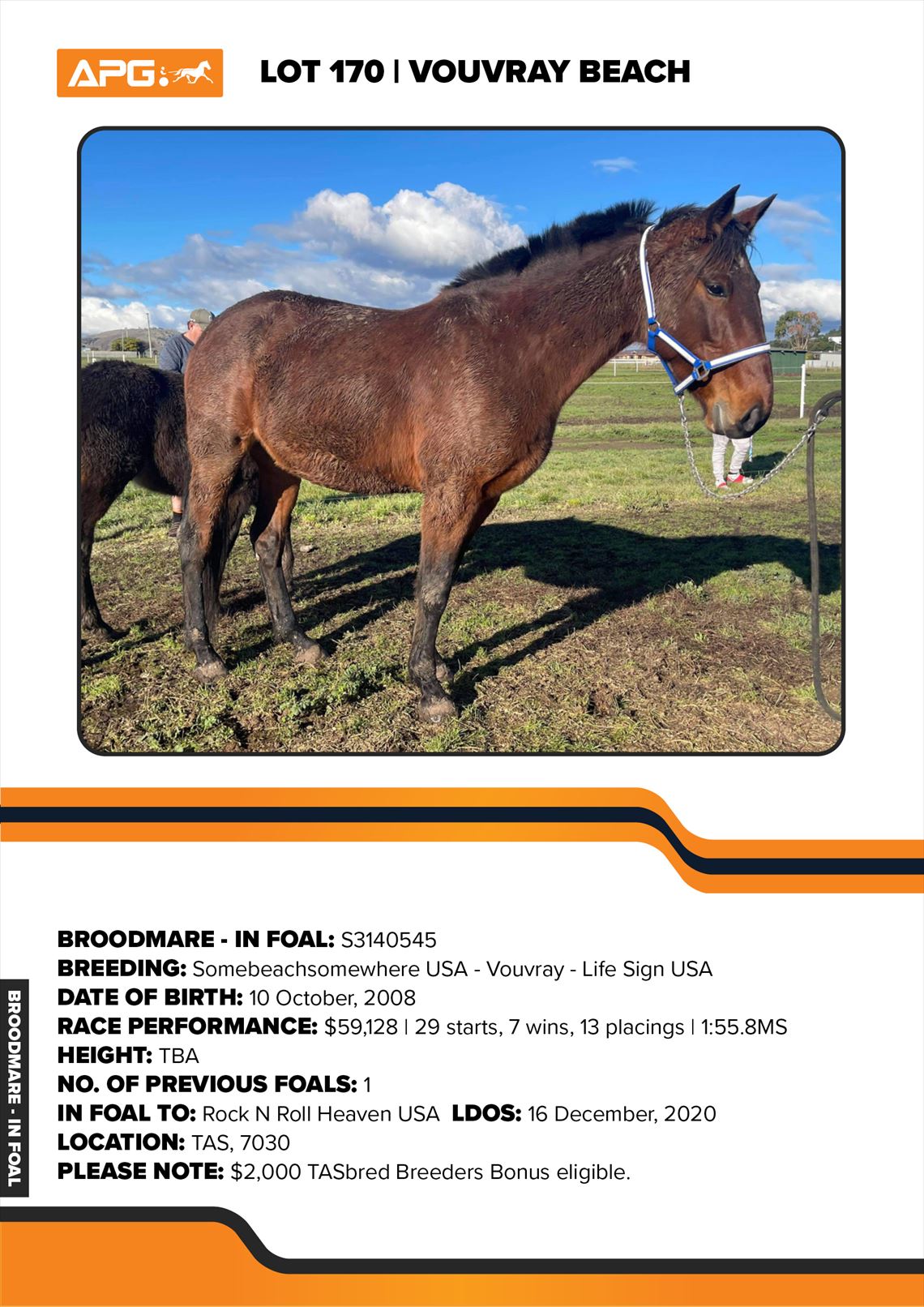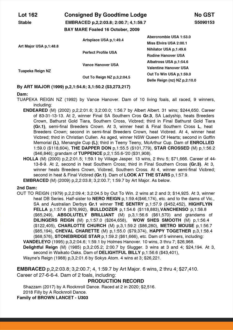 | Mare(+) | Embraced | Art Major USA | Tuapeka Reign NZ | Goodtime Lodge | VIC, 3250 | Brett Lunghusen | $1,750 |