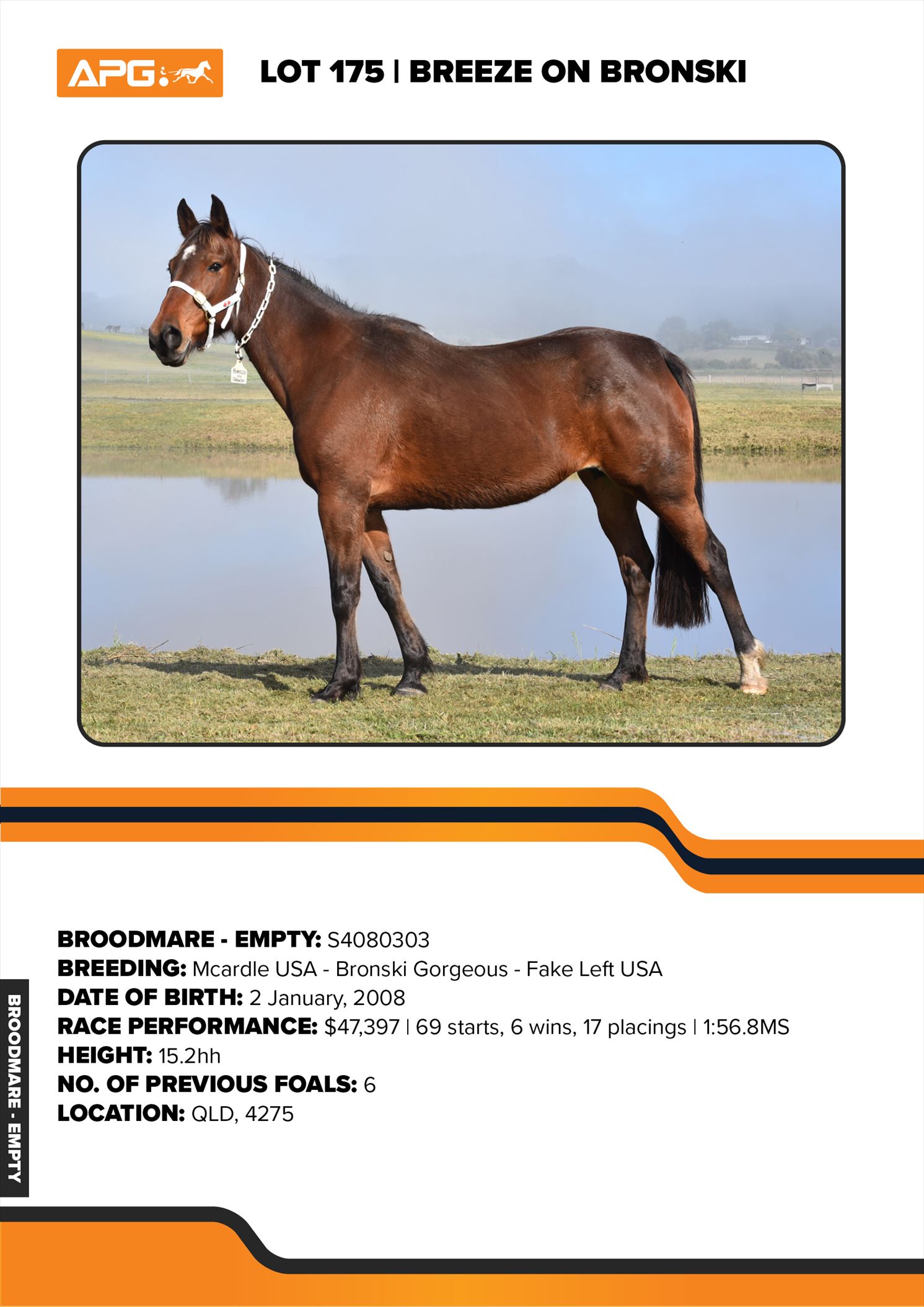 | Mare | Breeze On Bronski | Mcardle USA | Bronski Gorgeous | Pinaroo Park | QLD, 4275 | Jamie Durnberger-Smith | $5,000 |