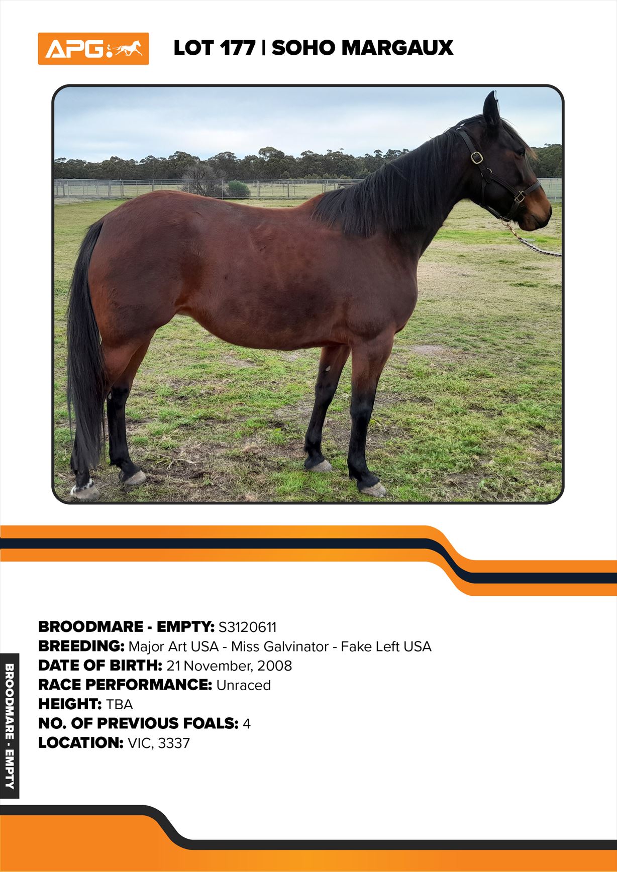 | Mare | Soho Margaux | Art Major USA | Miss Galvinator | Soho Standardbreds | VIC, 3337 | Jamie Durnberger-Smith | $8,500 |