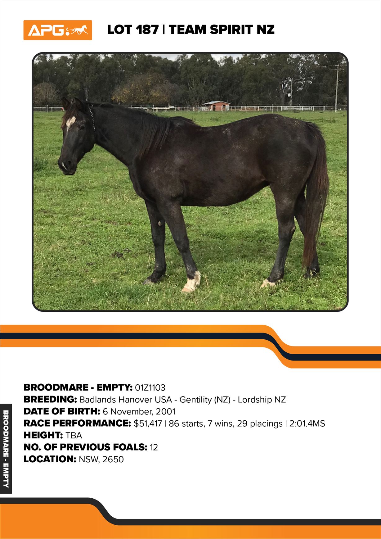 | Mare | Team Spirit NZ | Badlands Hanover USA | Gentility (NZ) | Yirribee Pacing Stud | NSW, 2650 |