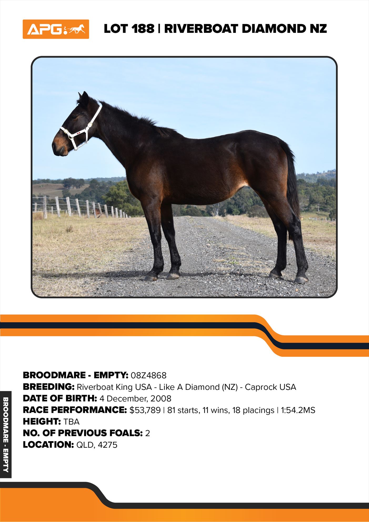 | Mare | Riverboat Diamond NZ | Riverboat King USA | Like A Diamond (NZ) | Brisbane Pastoral Company Pty Ltd | QLD, 4275 | Matthew K Pfuhl | $700 |