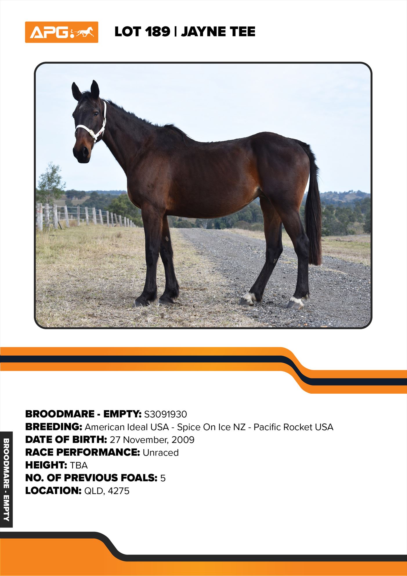 | Mare | Jayne Tee | American Ideal USA | Spice On Ice NZ | Brisbane Pastoral Company Pty Ltd | QLD, 4275 | Monarch Farm | $1,500 |