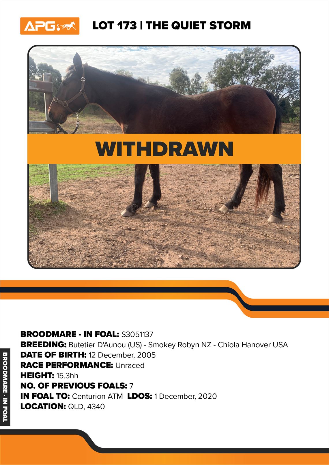 | Mare | The Quiet Storm | Buvetier D'Aunou | Smokey Robyn NZ | Trump Bloodstock Pty Ltd |
