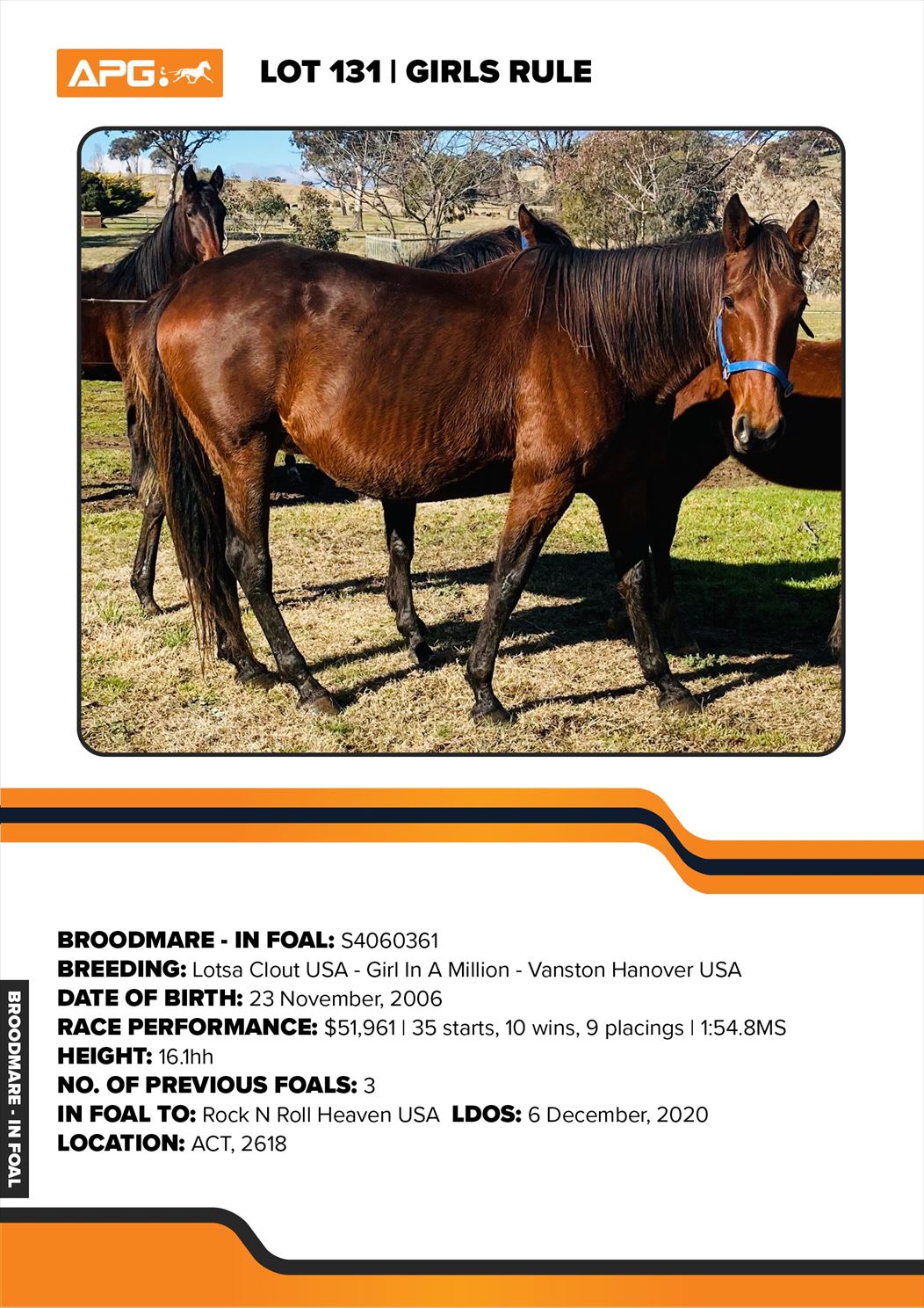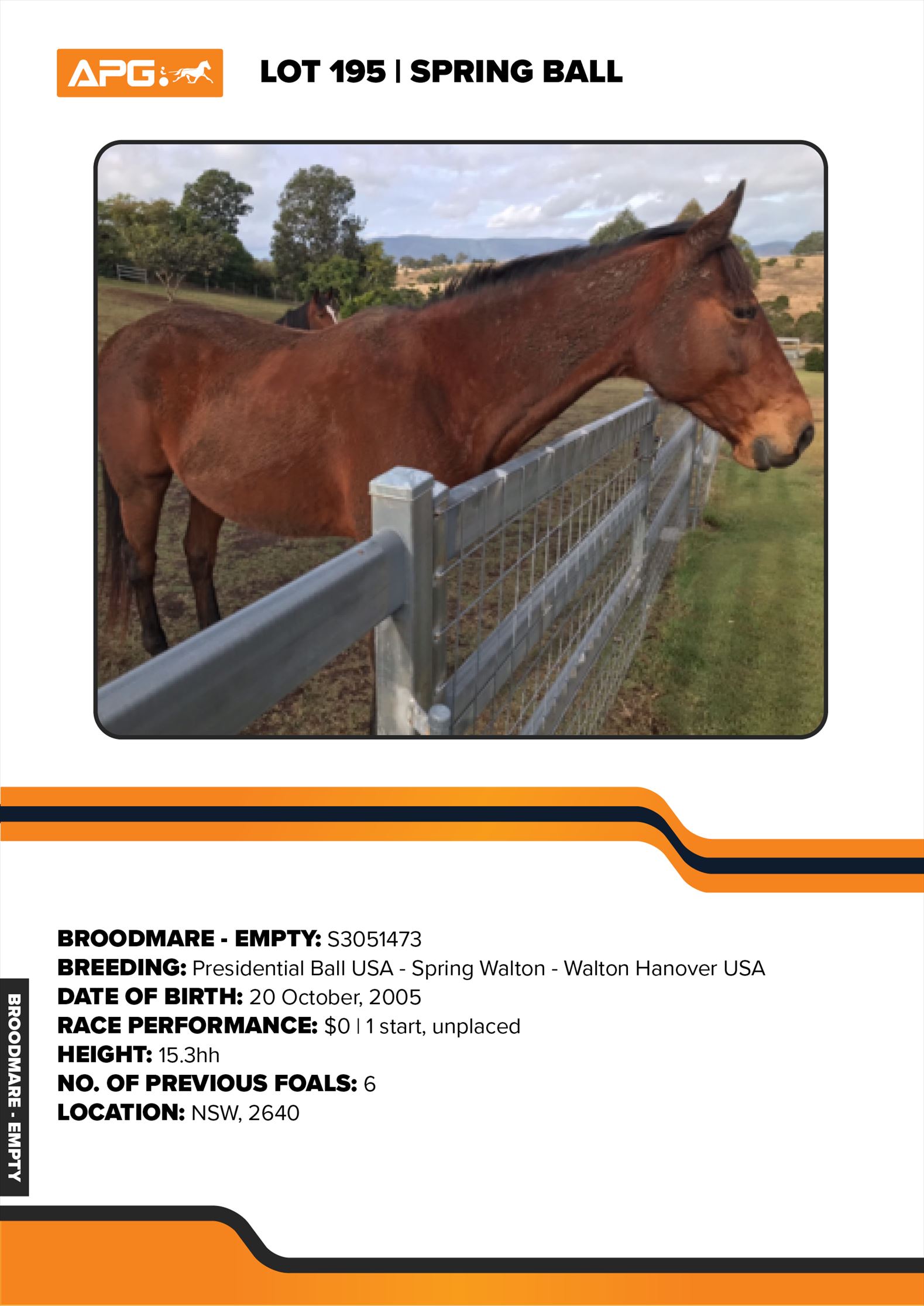 | Mare | Spring Ball | Presidential Ball USA | Spring Walton | Royce Gregory | NSW, 2640 | Matthew K Pfuhl | $800 |
