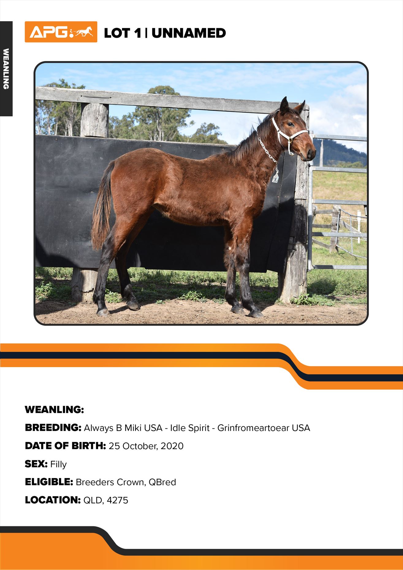 | Filly | Hay Bale Hustler | Always B Miki USA | Idle Spirit | Brisbane Pastoral Company Pty Ltd | QLD, 4275 | Ktc Bloodstock | $20,000 |