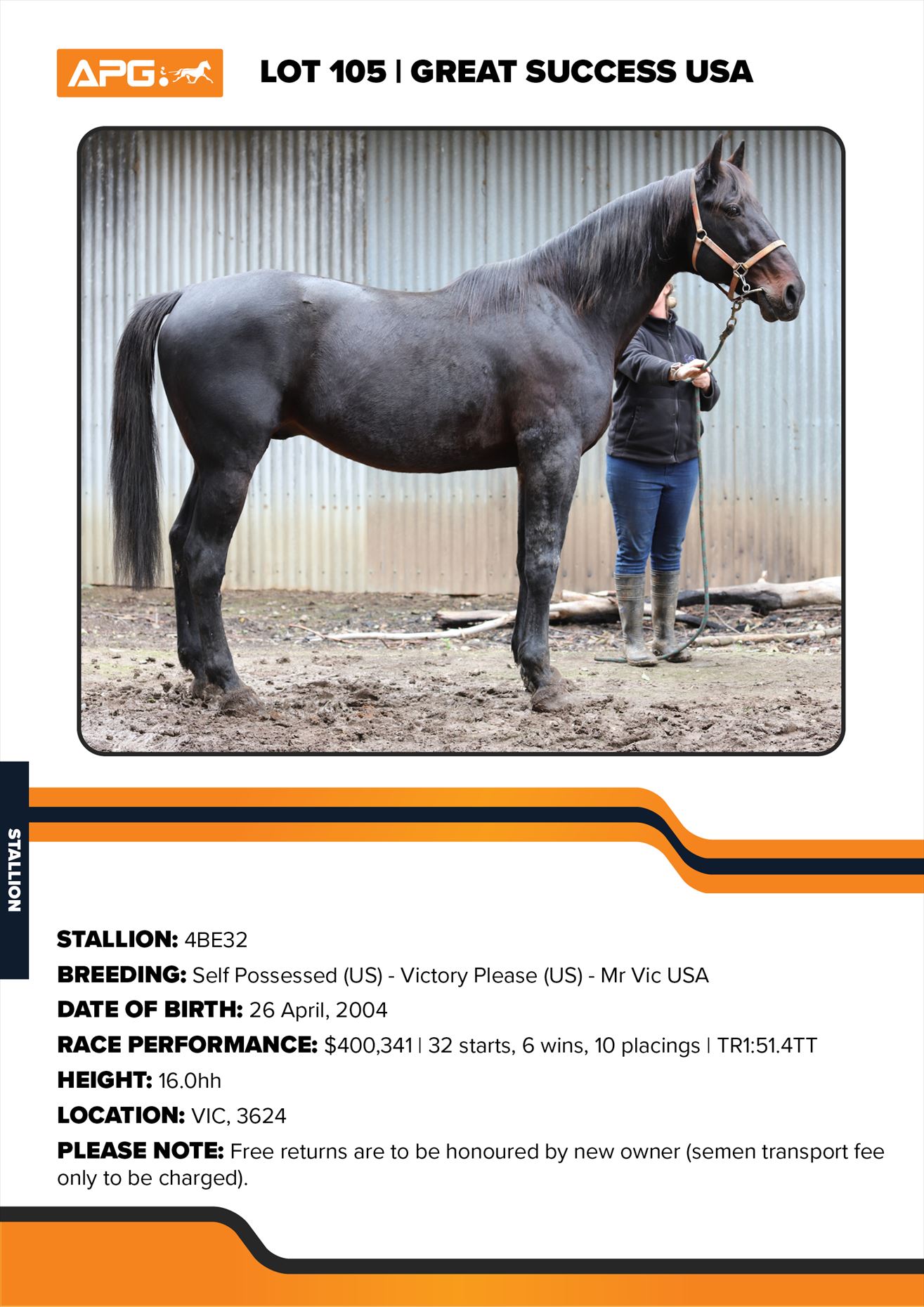 | Great Success USA | Tiabamba | Trotters Australia | VIC, 3624 | Kathie Dawson | $1,500 |