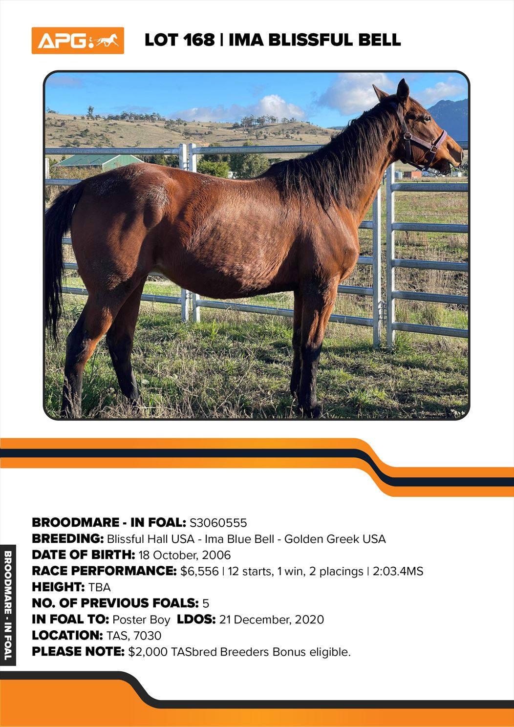 | Mare(+) | Ima Blissful Bell | Blissful Hall USA | Ima Blue Bell | Jamie Cockshutt & Barry Cooper | TAS, 7030 |