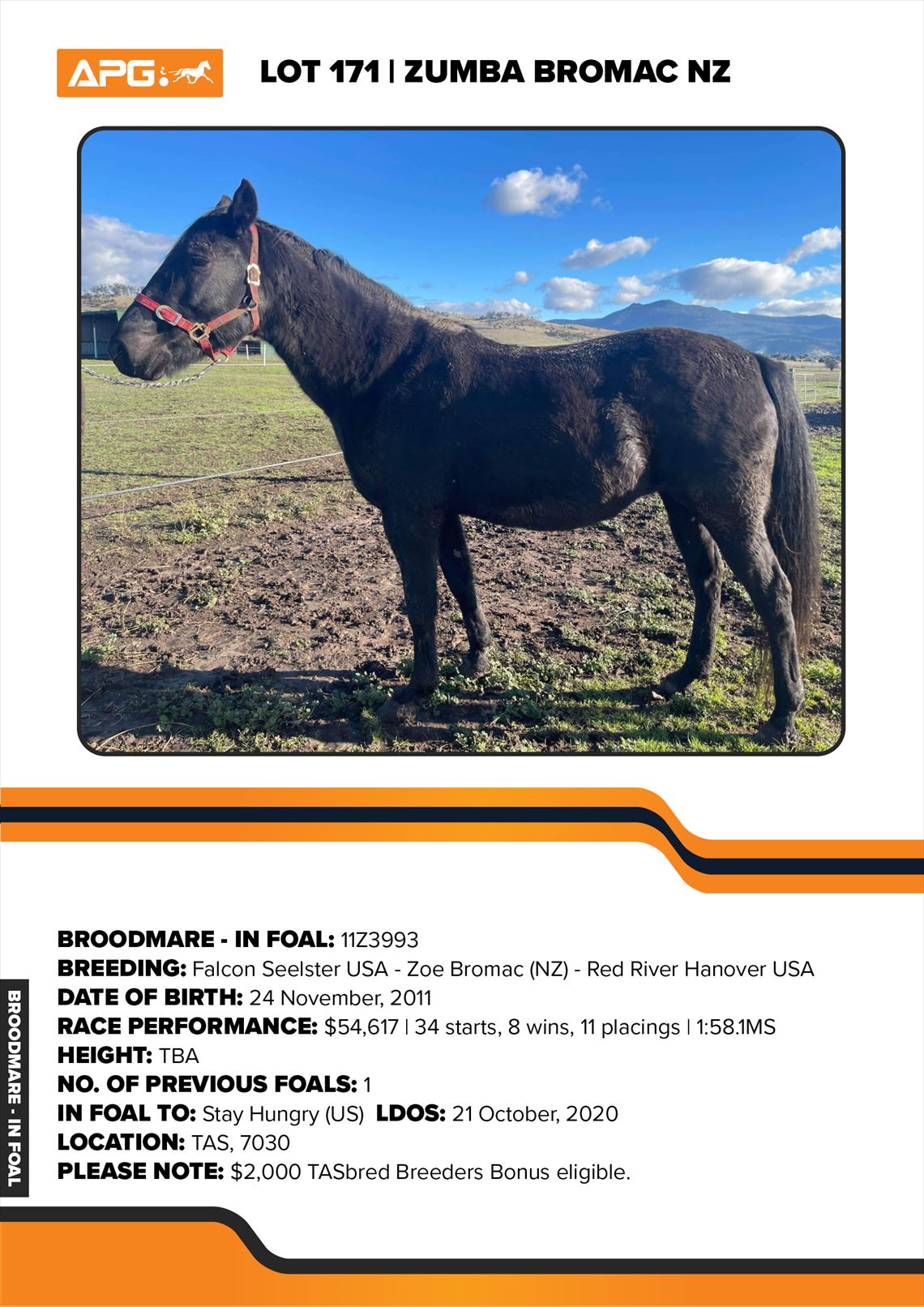 | Mare(+) | Zumba Bromac NZ | Falcon Seelster USA | Zoe Bromac NZ | Jamie Cockshutt & Barry Cooper | TAS, 7030 | David Simmonds | $8,500 |