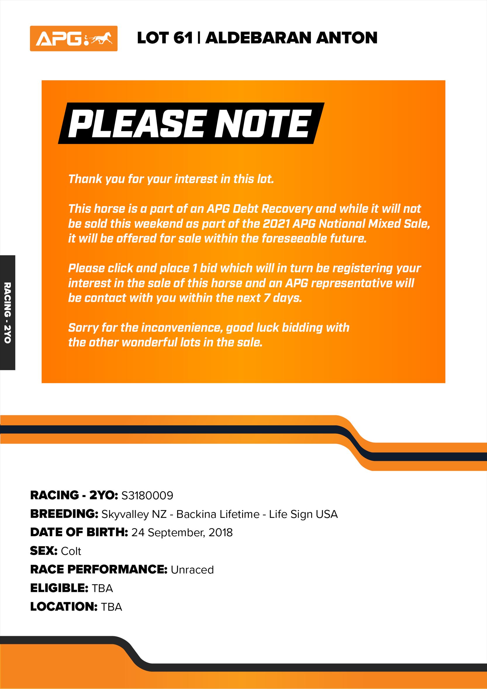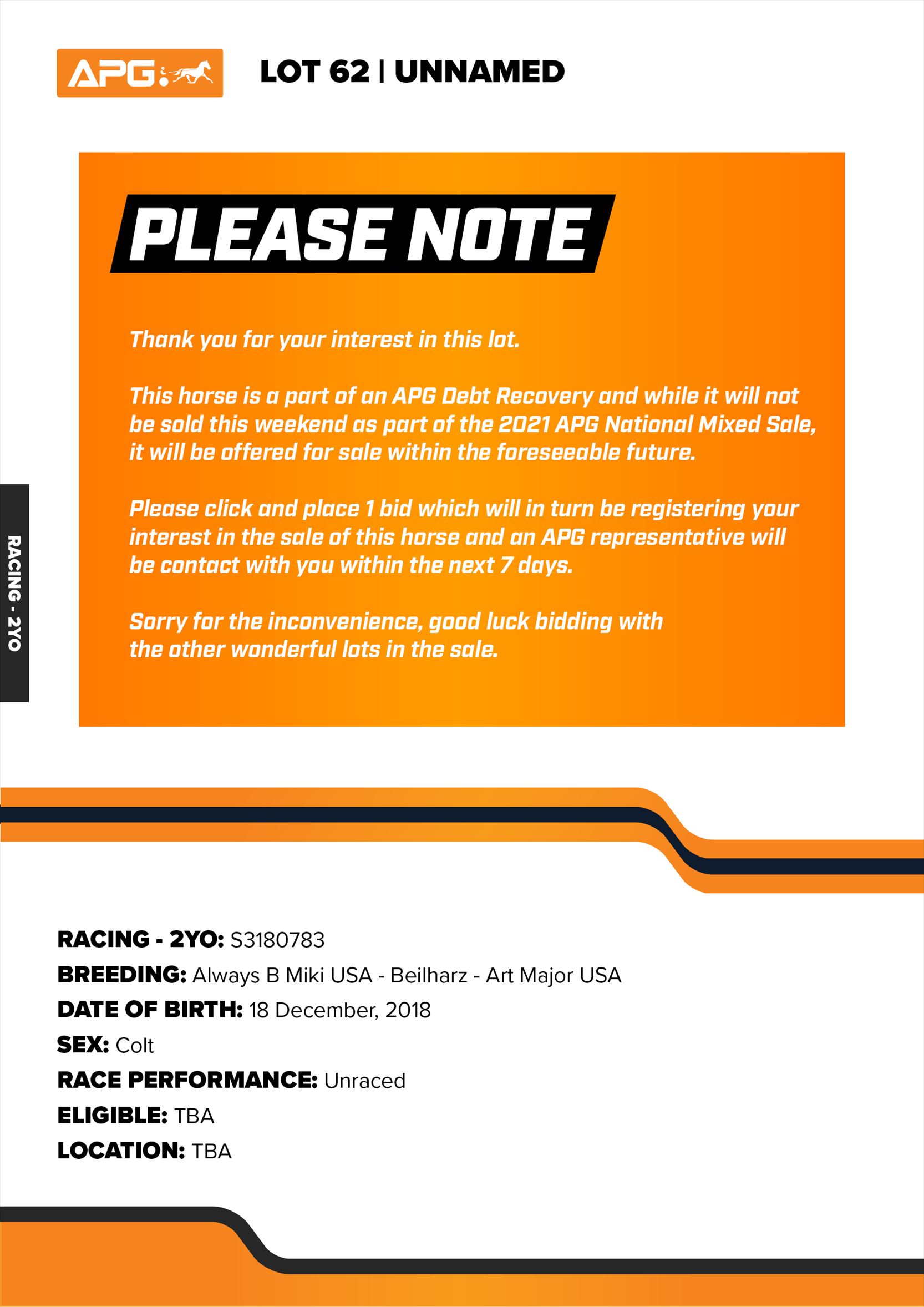 | Colt | Lets Go Bailey | Sweet Lou USA | Ima Grumpy Possum NZ | Donald Spedding & Maryann Harris | ACT, 2618 | John Mulrone | $13,000 |