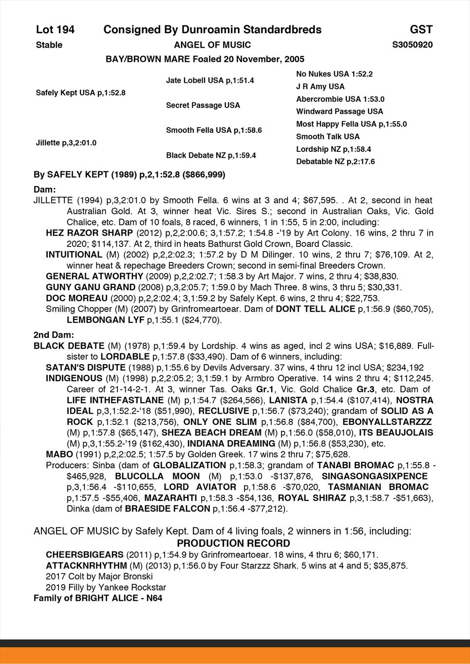 | Mare | Angel Of Music | Safely Kept USA | Jillette | Dunroamin Park | VIC, 3633 | Royce Gregory | $900 |