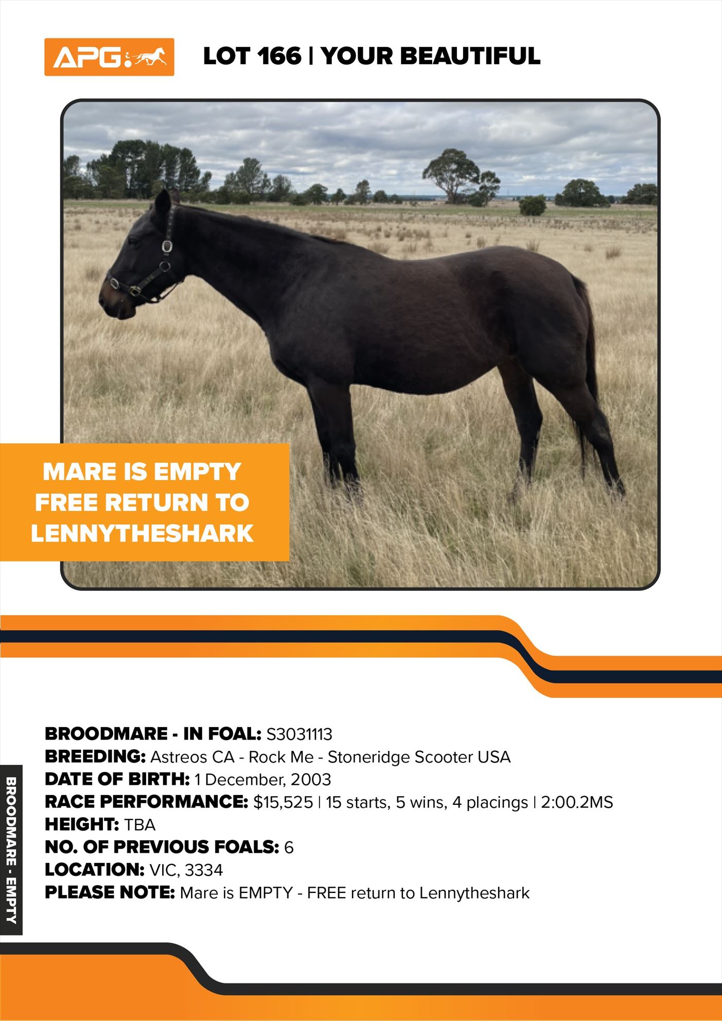 | Mare | Your Beautiful | Astreos CA | Rock Me | Travis Jude | VIC, 3334 | Royce Gregory | $800 |